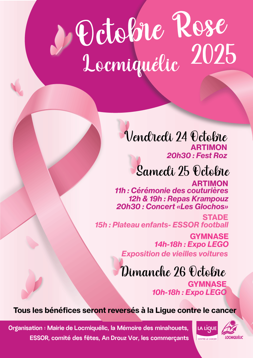 Dans le cadre d'Octobre Rose, la commune et ses partenaires, An Drouz Vor, La mémoire des Minahouëts, PLL Art et Traditions, Essor Foot, Comité des Fêtes des langoustines et les commerçants, organisent un weekend...